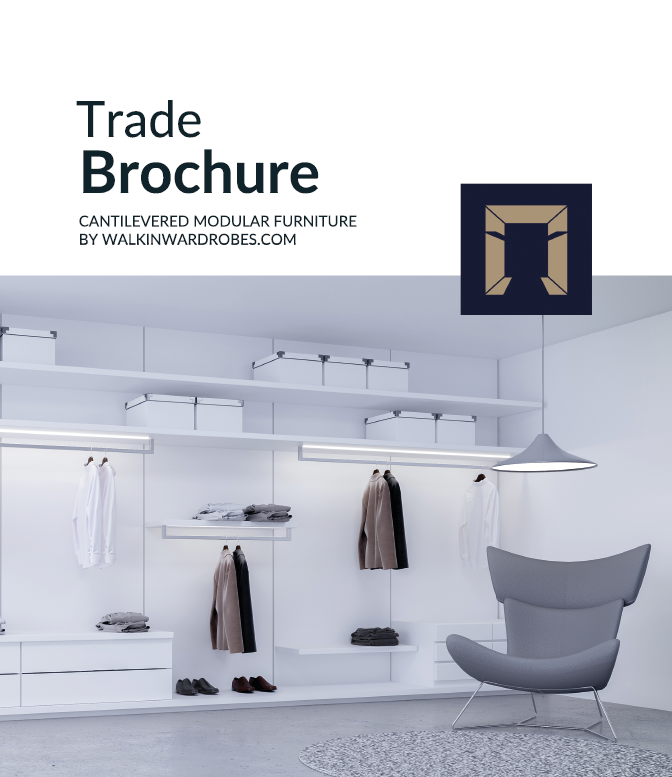 Our award-winning cantilever open wardrobe system offers your customers a bespoke walk-in wardrobe with interchangeable rails, shoe racks, shelves, and drawers.